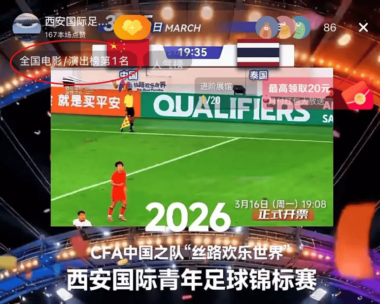 圆满完成2026CFA中国之队“丝路欢乐世界”西安国际青年足球锦标赛服务保障工作,依托全链路数字化运营、沉浸式科技营销及精细化用户服务,全方位助力赛事顺利开展,充分展现了公司专业的服务能力与责任担当;特别是通过新媒体扩大赛事声浪方面取得优异成绩,累计直播场次达77+场,总曝光量过千万次,荣获全国电影/演出榜第1名。()