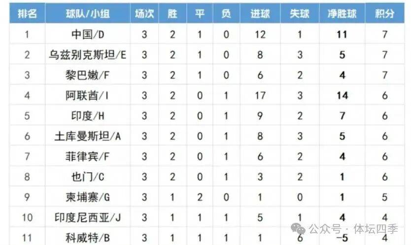 从最终的小组第二排名来看,中国队的表现尤为亮眼。他们不仅以7分高居所有小组第二之首,11个净胜球的优势也让他们在晋级竞争中占据绝对主动。值得一提的是,即便中国队在这场关键战中以小比分负于澳大利亚,他们依然能够凭借7分的积分优势,在仅有两支7分球队的情况下,稳稳获得晋级资格。这充分展现了中国队在预选赛阶段的稳定发挥和强大实力。
