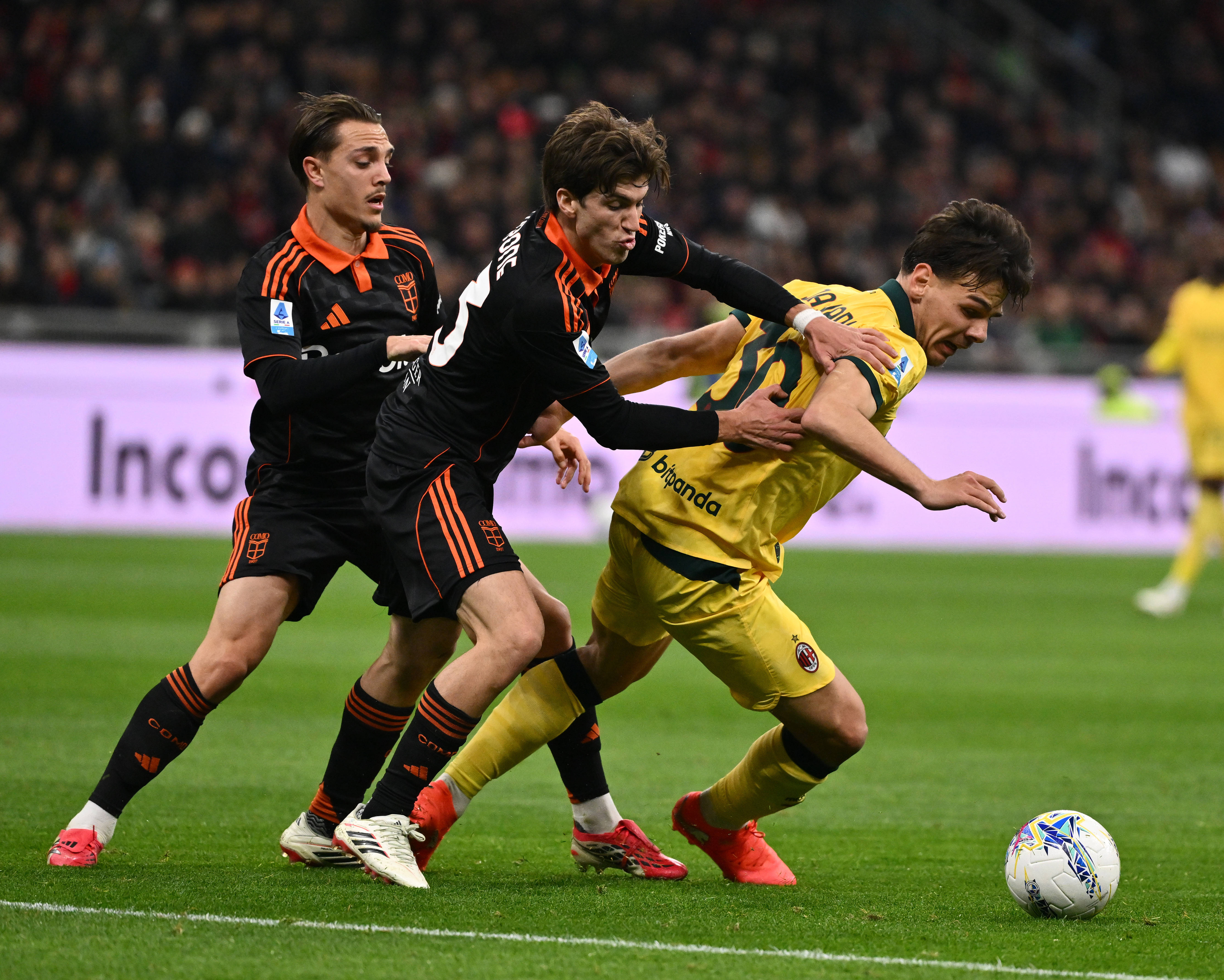2月18日,科莫队球员卡克雷(左)、佩罗内(中)与AC米兰队球员亚沙里在比赛中拼抢。 新华社发(阿尔贝托·林格利亚摄)