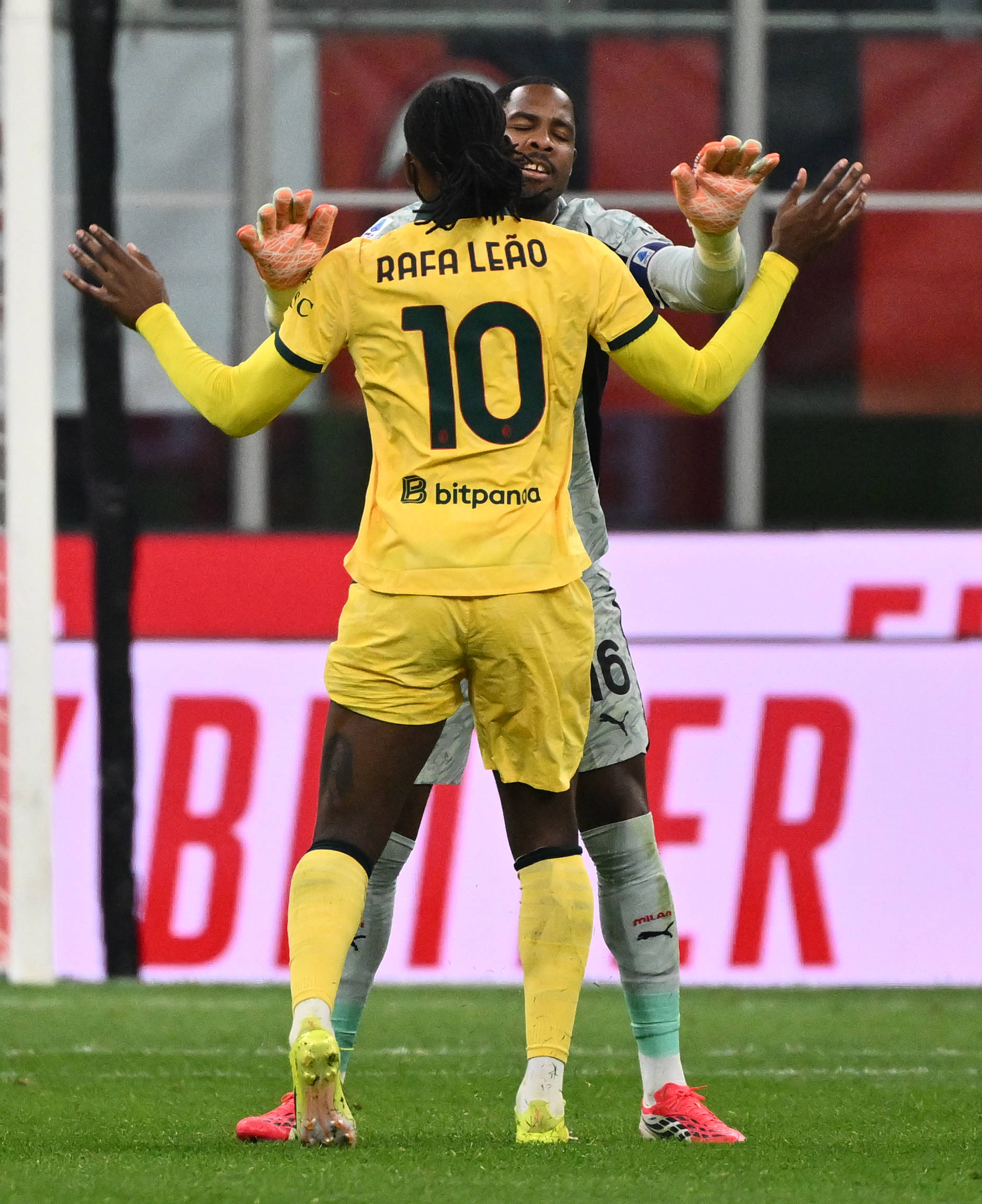 2月18日,AC米兰队球员莱奥(左)与队友迈尼昂庆祝进球。 新华社发(阿尔贝托·林格利亚摄)