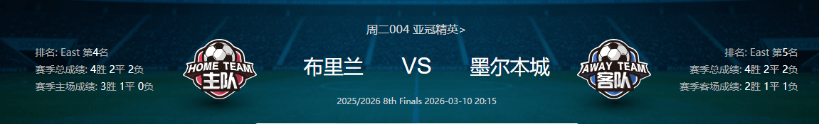 综合来看,布里兰在球队状态、主场战力、阵容完整度、战术适配性、晋级主动权等多个维度均形成全面碾压优势,尽管中场核心颂克拉辛停赛,但球队进攻火力点分散,整体战术体系不受太大影响,主场作战的攻防稳定性依旧拉满。