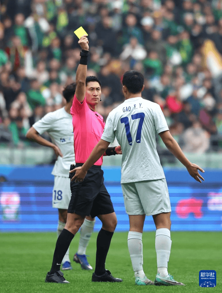 3月21日,主裁判马宁(左一)向替补席上的上海申花队球员王世龙(右一)出示黄牌。