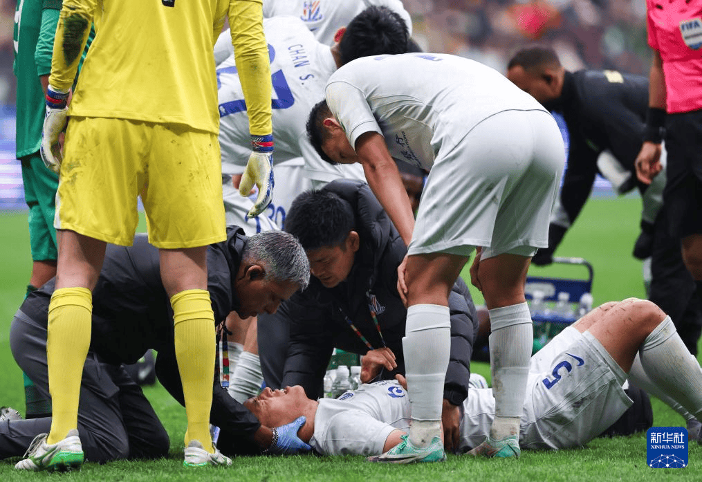 3月21日,主裁判马宁(上)在比赛中查看倒地的北京国安队球员阿不都海米提·阿不都格尼。