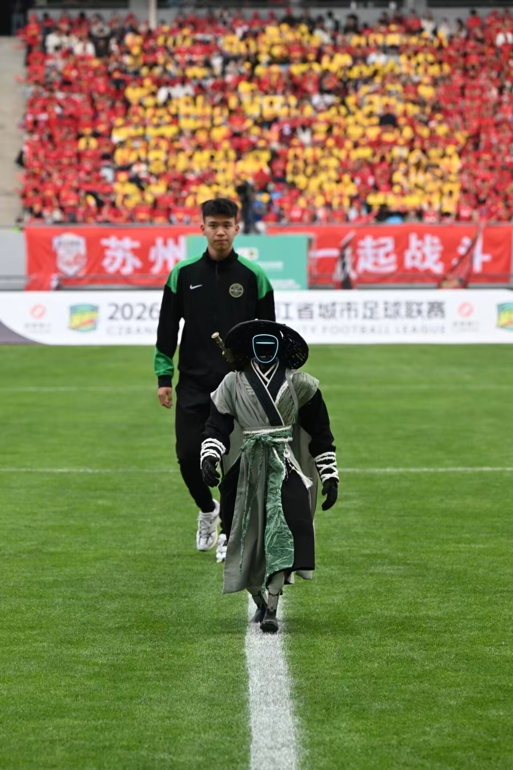 4月6日,机器人“冲冲”和浙江籍足球运动员王钰栋为“吴越杯”揭幕战开球。 嘉兴发布 供图
