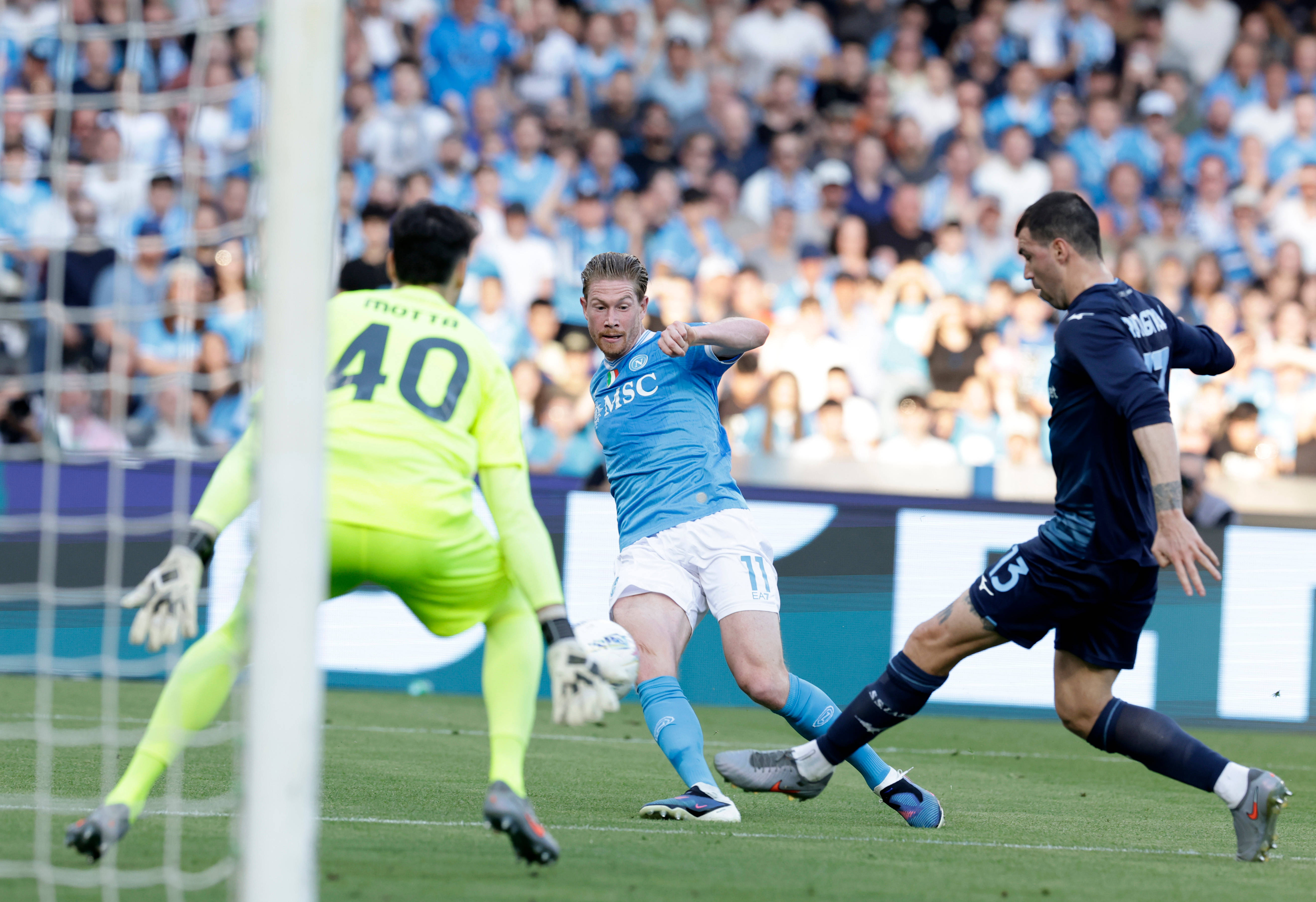 4月18日,拉齐奥队球员罗马尼奥利(右)与那不勒斯队球员德布劳内在比赛中拼抢。 新华社发