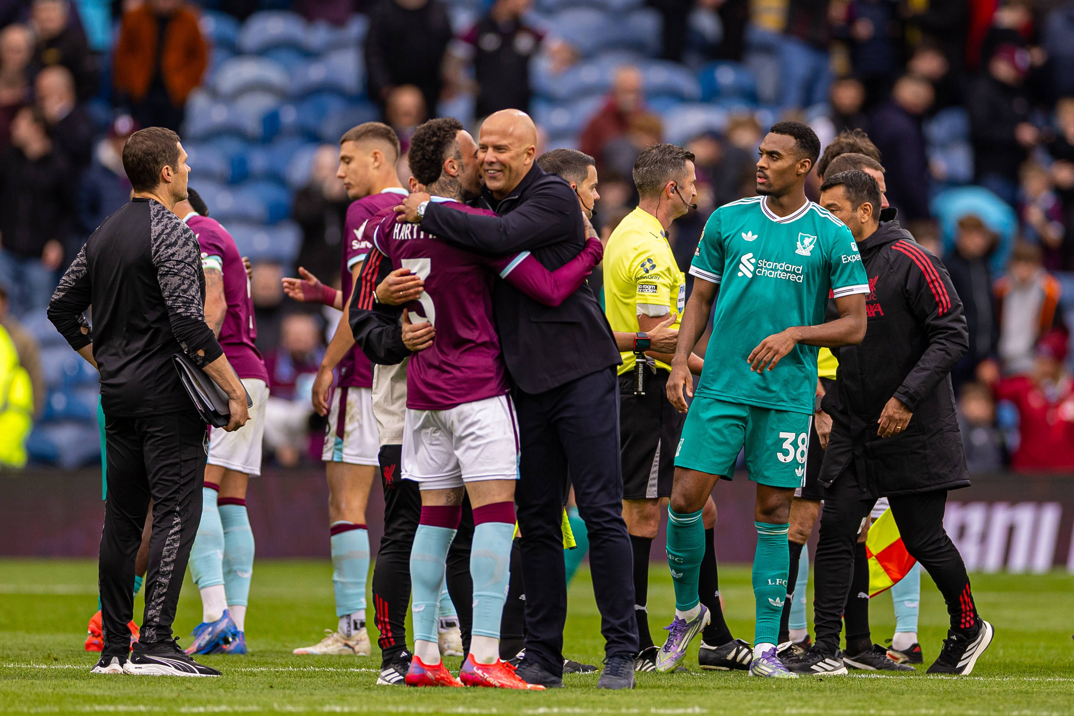 9月14日,利物浦队主教练斯洛特(前右)赛后拥抱伯恩利队球员哈特曼。 新华社发